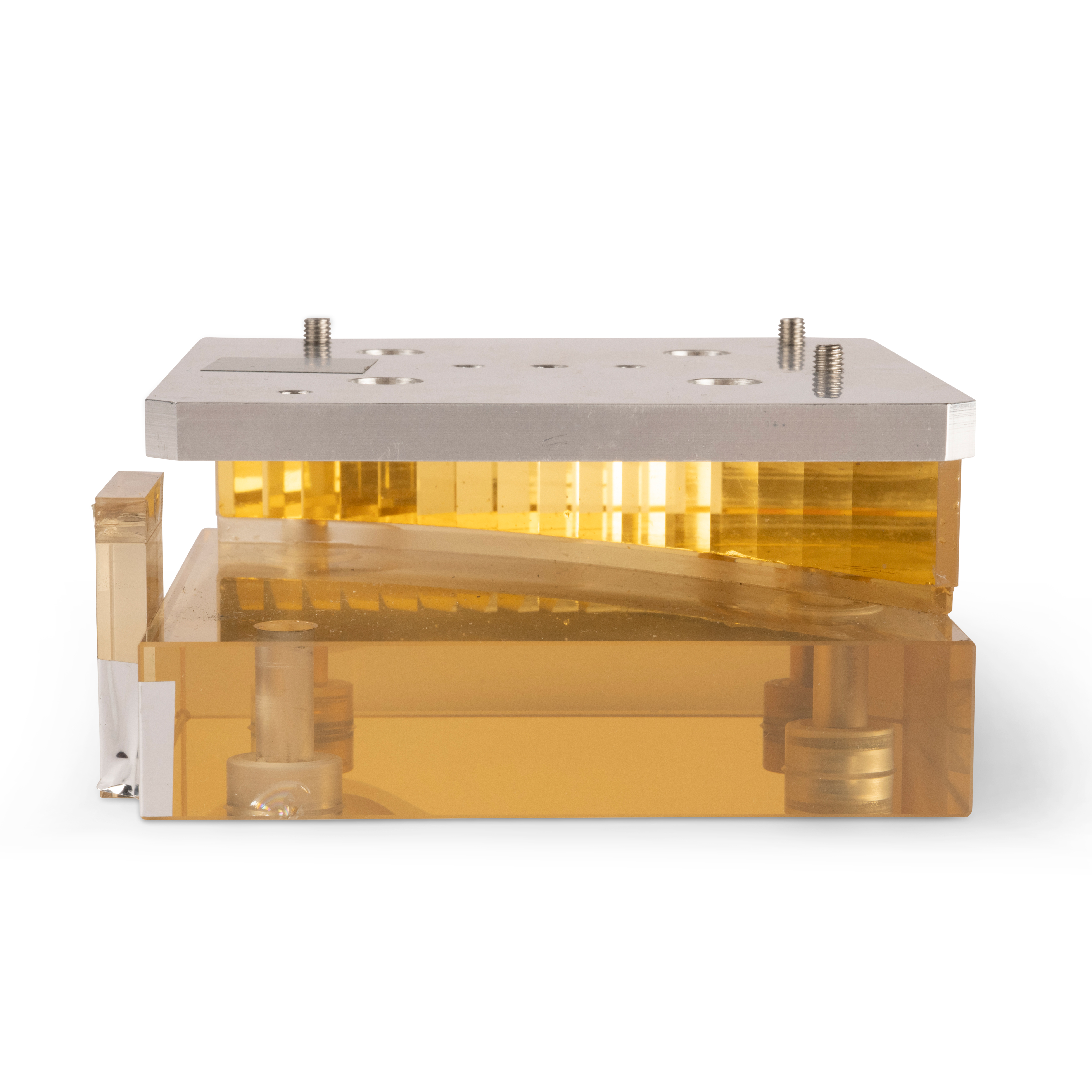 This glass object is part of an advanced optical apparatus that was decisive in Reinhard Genzel’s research on a super massive black hole at the centre of our galaxy. He used a method called Integral Field Spectroscopy to combine image analysis with spectroscopy. This part of the apparatus, a 3D Slicer, was used in one step of his studies. Highly simplified, the experiment deals with capturing light beams, splitting the beams into different wavelengths and then interpreting the data.