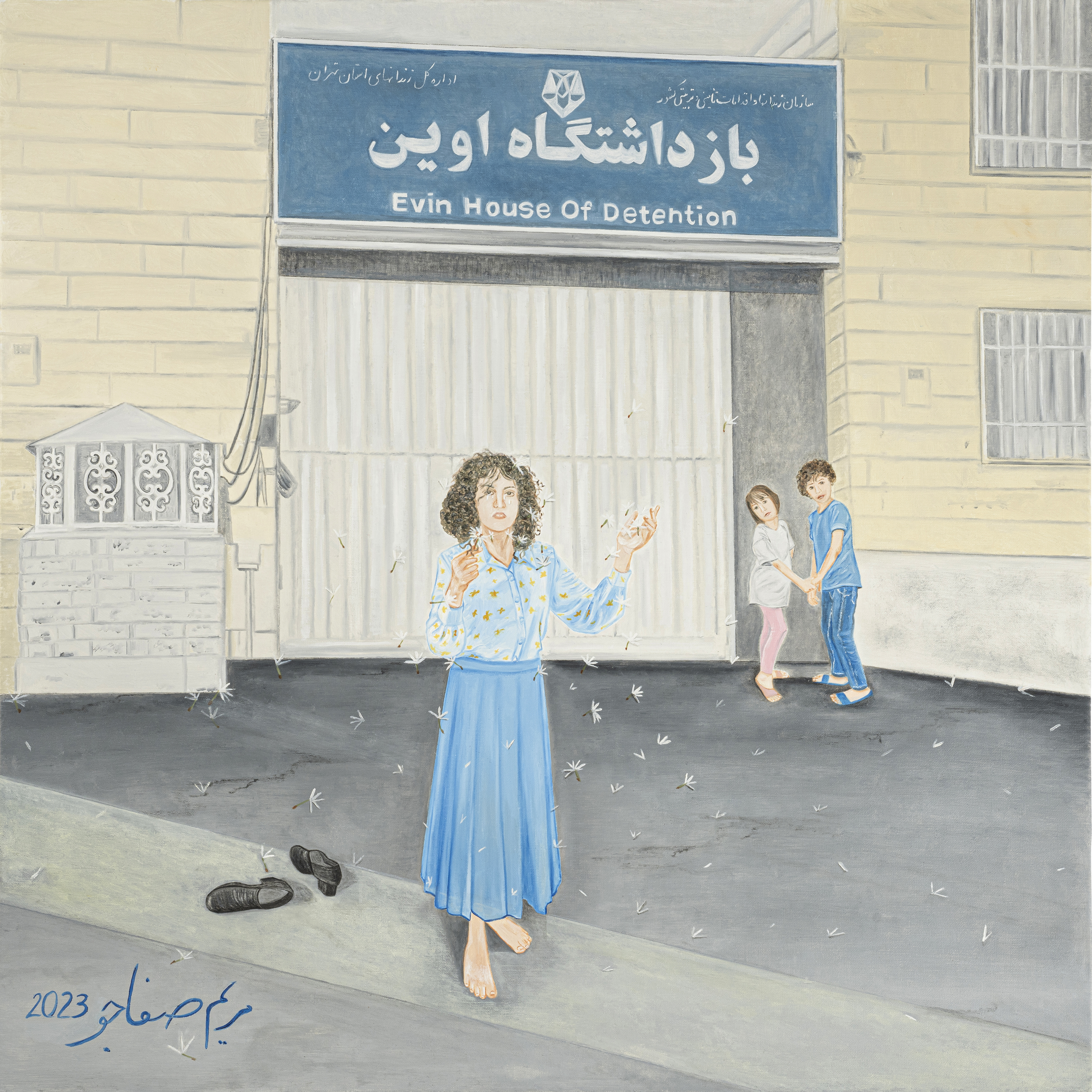 The subject of the painting "A Multitude of Separations" by the artist Maryam Safajoo is Narges Mohammadi and her two children, from whom she was separated during her time in prison. It was made after talking to people who are close to Mohammadi. Safajoo cites a letter from Mohammadi, written in prison:
