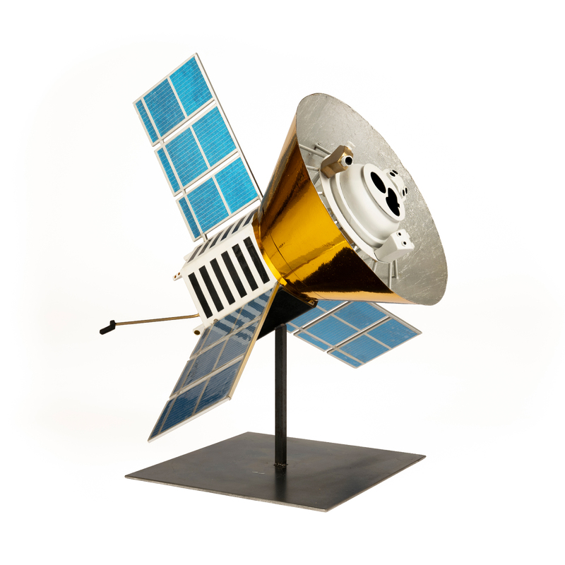 The model shows the COBE satellite, which was was used to measure cosmic background radiation. The results have provided a deeper understanding of the universe’s development and composition.