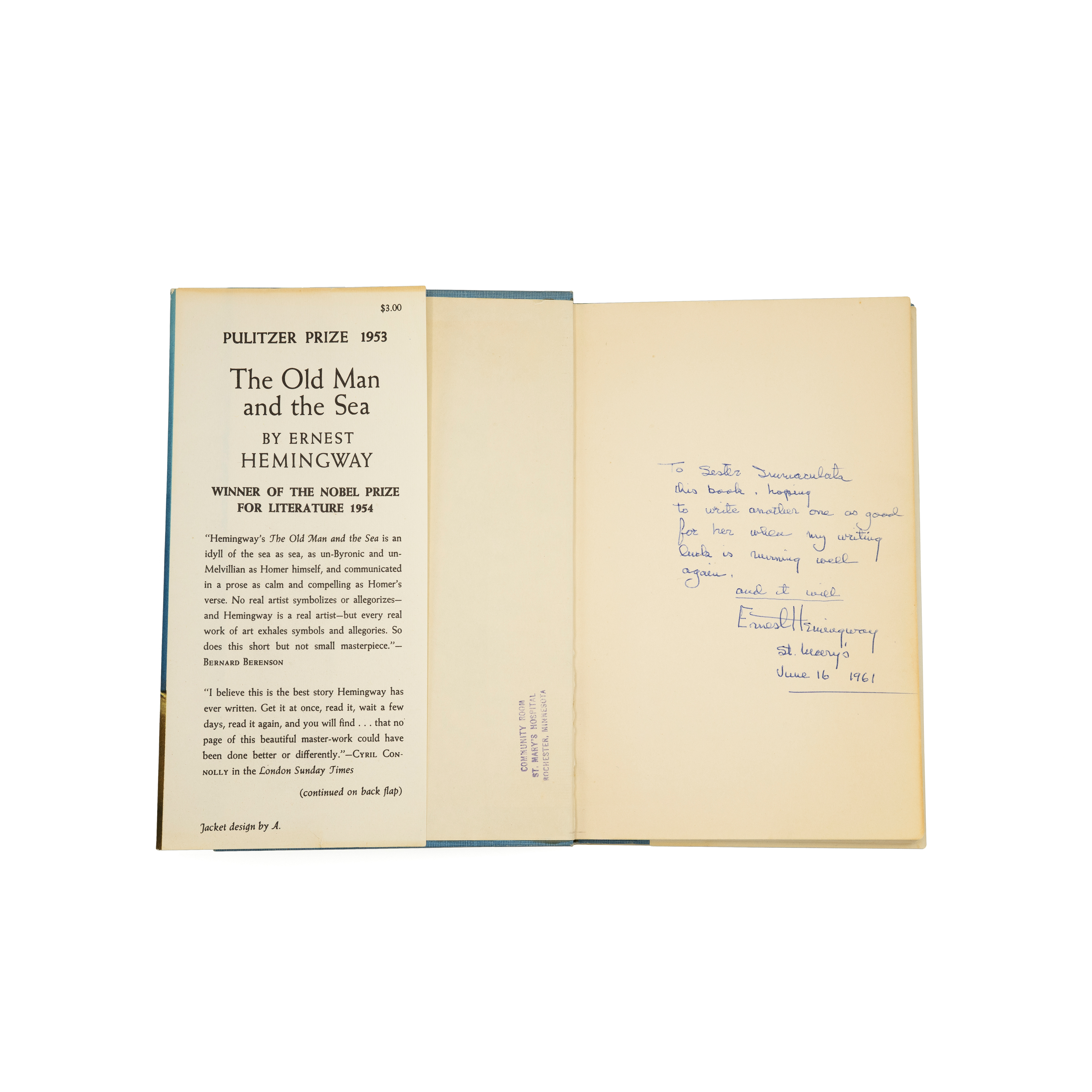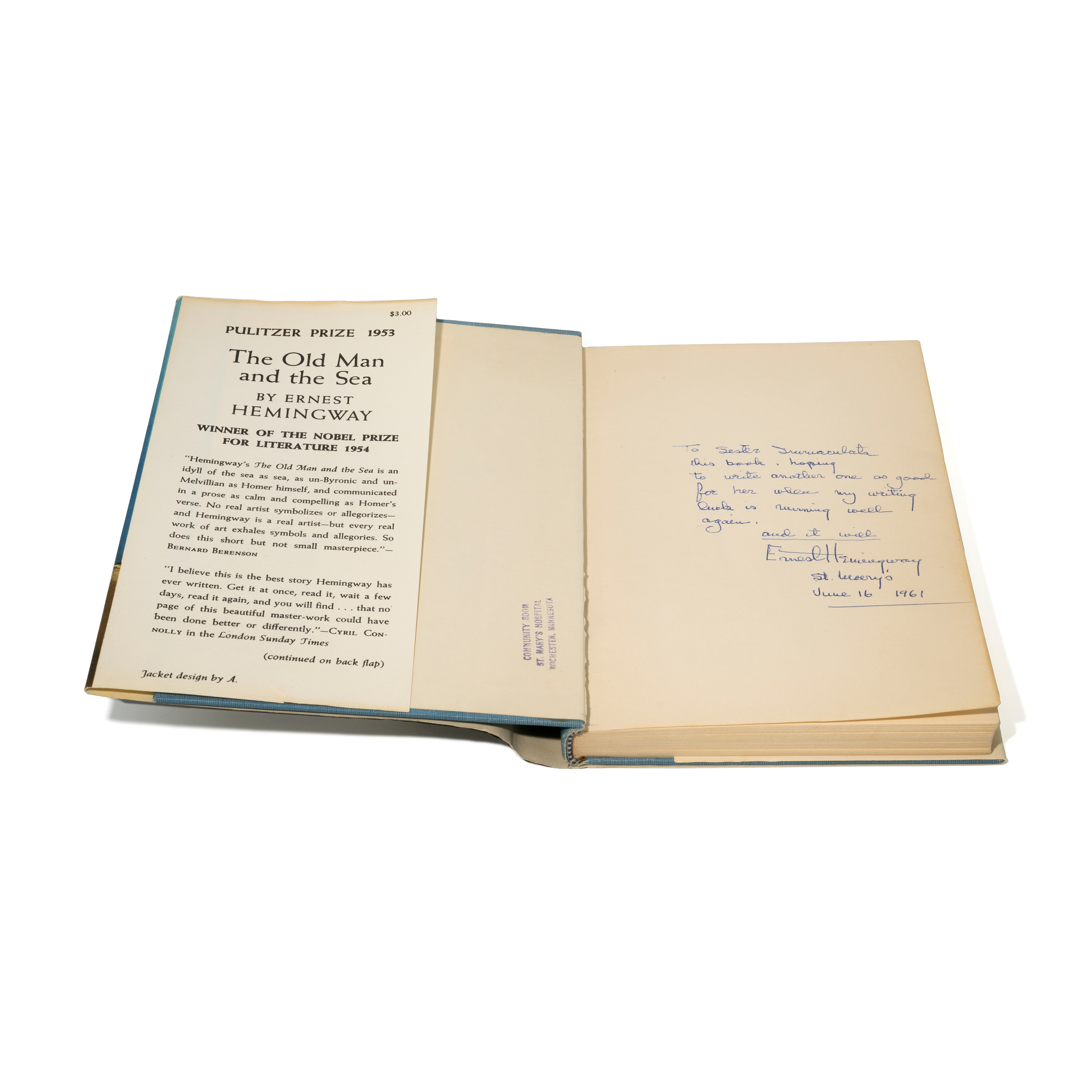 In this copy of The Old Man and the Sea, there is an inscription by Ernest Hemingway to a nurse who cared for him for a time shortly before his death.