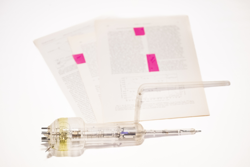 This glass tube was an important part of the apparatus for John Clauser’s experiment on quantum entanglement. Clauser made pioneering contributions to prove that quantum entanglement is a real phenomenon. He made the actual tube and used it to produce entangled photons in experiments in 1974 and 1976. The publication next to the test tube describes experiments and findings.