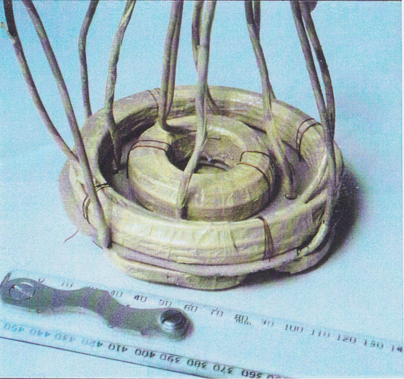 Denna spole användes i Wolfgang Ketterles experiment 1996 för att skapa “Bose-Einstein-kondensat”. Materialet som håller ihop spolen är epoxi. Spolen kyldes med vatten genom rören.